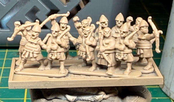 Classic Fantasy Battles orc archers. Credit: Rich NutterThat said, this box at least doesn’t really map onto Warmaster Revolution’s army lists in a satisfying way. WMR’s “Orcs” army list doesn’t really have unit options that map to the contents of this box in a satisfying way. Warg riders can be Wolf Riders, your spearmen and swordsmen could be Orc Warriors, and the heavy swordsmen and axemen could be Black Orcs, but then your orcs with bows don’t really map to any option in the army list (they could be goblins, who have a ranged attack, I suppose). Characters and other unit options are also an issue, as there aren’t any command models in the kit that can be based singly. Wargames Atlantic’s base sprue does include the pill-shaped and circular bases that you might want to put Warmaster characters on, so the bases at least will be useful for people delving into WMR, even if the models may require some support to work.