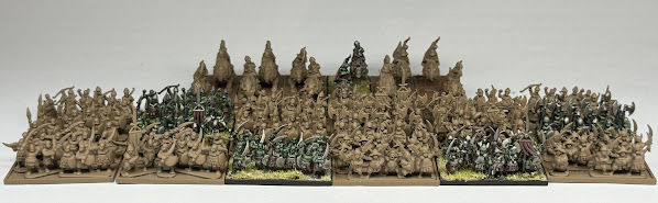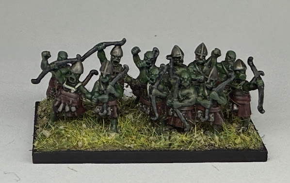 A base of Classic Fantasy Battles orc archers. Credit: Rich NutterManifestly failing to think very hard about that second point, I primed my minis in Trench Brown from the Colour Forge. In my defense, for this project I was very focused on the first point, speed, and I really didn’t want to end up with bright white areas glaring out from the middle of the unit if I didn’t catch them with the paint. I think when I paint some more though, I might give them an ivory or white zenithal to make them pop a bit more.