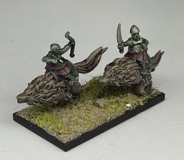 Classic Fantasy Battles warg riders. Credit: Rich NutterNext, I gave everything a drybrush of TTC Vampire Fang (a Screaming Skull equivalent). As well as providing a consistent highlight on everything, this helped to pick out things like helmet horns and orc fangs without an extra step, and added some texture to the wargs’ fur. Finally, everything got an all over wash with Army Painter Grimdark Shadow (from the John Blanche sets), mixed down with a bit of medium. After it dried I went back to pick out a couple of straps in ivory, and then we were done!
