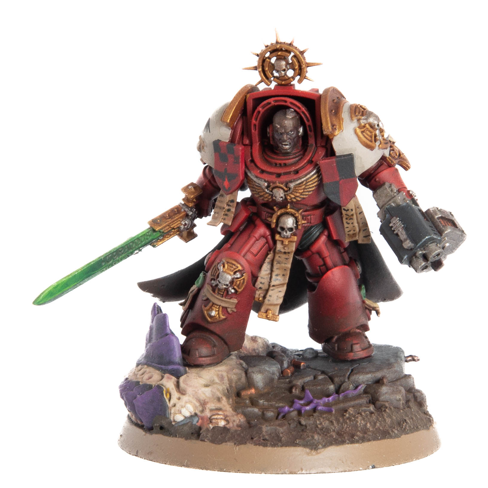 Blood Ravens Terminator Captain. Credit - SoggyThis heavy-armoured behemoth is a Leader that can join your Terminator Squad (or in wider play Terminator Assault Squads and Relic Terminators), and provides two powerful buffs for them. First up, Rites of Battle lets you use a Stratagem on the unit for free once per battle round, even if another unit has already been targeted with it that phase. This rules - while rarer, there are still some stratagems out there that cost you 2CP, so that’s a big discount, and this includes some important core ones like Heroic Intervention. That one is clearly where this is aimed here - the other ability the Captain provides is Charge re-rolls for the unit, so a squad of Terminators with him at the head can absolutely dominate the centre of the battlefield. He also adds some hefty additional killing power, sporting six attacks with a S5 AP-2 D2 Relic Weapon. He’s also pretty chunky at T5 6W and a 4+ Invulnerable Save, so even if his bodyguard fall against the horde, he won’t go down easily. The datasheet also gives a preview of some other options you can take with your existing Terminator Captains - Thunder Hammers with Devastating Wounds, paired lightning claws with a mighty seven Twin-linked attacks, and a Chainfist with Anti-Vehicle 3+, helping him carve through vehicles. Finally, if your Captain is modeled with a shield, this is now a Relic Shield, adding an extra wound (as Terminators appear to just have a 4+ Invulnerable Save these days). Everything a Space Marine should be, all-around, though you can also immediately see 10th’s trend away from having as many re-rolls, with this Captain not providing any.
