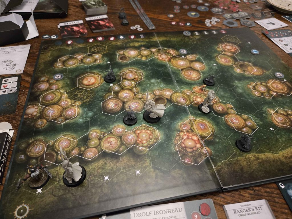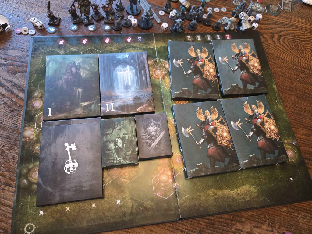 This is a living review of the game through the end of Act 1 (of 3). I intend to follow up when I have progressed further or beaten the game.Darkwater shakes up the Warhammer Quest formula by switching to a simpler core action mechanic. Each hero has three actions they can take, and gets the equivalent of three actions per activation. This is explained in a way that my wife and I found a bit clunky. You have a card to represent each action, and "tap" it for a turn to gain the action resource. This game is a bit of a ">space hog, we opted to use tokens to track actions instead and kept one set of these cards between us for reference. There is an alternate set of available actions if you are on death's doorstep, so keep your action cards handy.