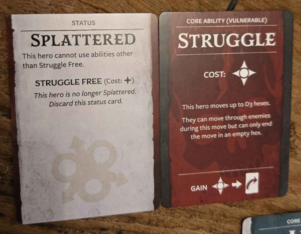 Dice are significantly streamlined from the past two games. Gone are the success dice that I always found a bit hard to read. Everything is done via a D6 (or D3). Many actions use standard D6's, enemy behaviors are governed by two custom dice. These dice determine if the enemies move, attack, do both, can't crit, auto crit, and so on. Each die has a face for a special ability, an image that I suspect will be burned into players' minds. In the intro scenario, this result means that the ghostly-deer-looking Mire Kelpies will barf on a hero in range, forcing them to burn an action to break free. Scarier enemies have some pretty horrifying effects, like a charging attack or applying a curse from afar.