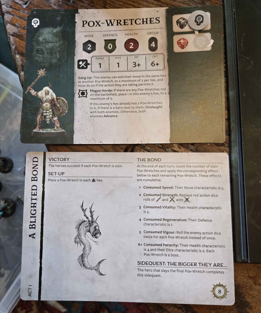 Unlike games that have a more traditional down-the-line initiative system, your foes will activate in between each hero's actions. Smaller enemies activate in groups, meaning that the closest four little guys will be moving / attacking / barfing in between each go. This can get deadly very quickly, even with smaller enemies. Sticking together and playing to your strengths is key! Each type of enemy activates in the enemy turn, but the leader (whoever goes first) chooses that order - so there could be some creative play having the little guys go first. At the end of the entire battle round (all heroes have activated, and the enemies have gone after), move the marker on the top right side of the enemy card down to the next row, or back up if it is marked as such. This means that the enemies have patterns you might need to watch out for... you might want to save your frontal assault for the turn after if the big bad is more likely to auto-crit or start shooting off curses. This is pretty clearly mentioned in the instructions, but left out of the quick ref - so don't forget!The map and enemies are laid out in Encounter cards. Each card tells you which map page you are playing on, the enemies you will encounter, where everyone will deploy, special rules that may be active, and how to win (or lose). Scenario rules can supersede regular rules as written! Enemy cards list the key stats - how far can they attack, how many hexes do they move, do they have armor, how many health does each have, and how many of this enemy will activate when it comes up in the initiative order. Some enemies may crit on a lower roll than six, so keep an eye on that stat. The cards also list the passive abilities (two Pox-Wretches can occupy one hex) and the dreaded special action dice result - in this case, a lone Wretch summons a dead friend to their hex!