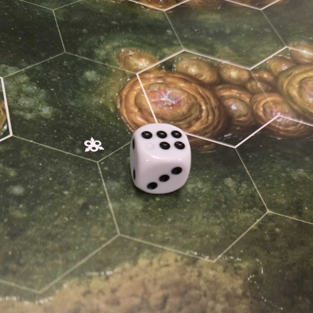 - Two custom dice for enemy actions, and some buck-average white-and-black 12mm D6's