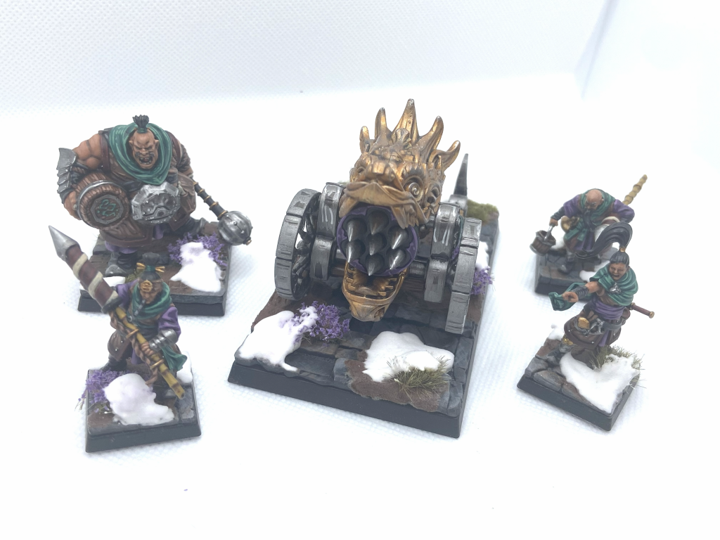 The Artillery of the army is grand and looks like it's been lifted directly from Warhammer Total War (with the exception of the Bull pulling it). These are really imposing Warmachines and take up lots of room on their 60x100mm base. Unlike the other two units in this box I would really recommend painting it before completing the final stage of assembly. There are area's behind the wheels around around the back of the barrels I really struggled to get into and paint correctly once it was all put together. The other thing to mention is that the crew has loads of character. There is one sculpt which is always built the same way but the two other crew members have 2 options each meaning you can really differentiate between the models within this box. The Ogres are also excellent with 2 "back" options and 2 arm sets. What this means is that you'll be able to build 4 fairly unique Ogres (if you wanted that many) out of multiple kits without them looking like they've all got Twins which is great from a plastic set.