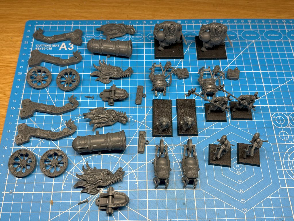 Cathayan Grand Cannon subassemblies - Credit: Colin WardBecause I'm picking up a second Battalion Box, I opted to do two Grand Cannons this time around. The subassemblies seem like overkill, but I want to paint the cannon body in a copper tone and the dragon detailing gold, which will be much easier to airbrush and then assemble after. Painting the crew will also necessitate tackling two wheelbarrows of gear and two ogre backpacks that include a couple of catfish. This is going to take a while...