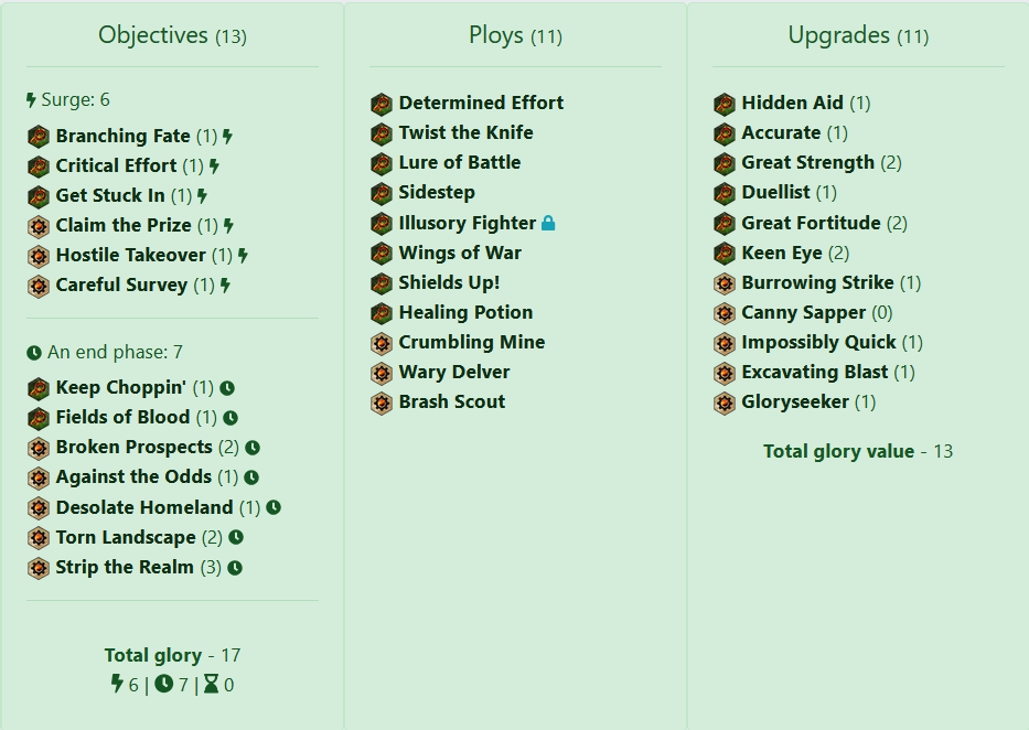 The next deck I plan to take for a spin will be a Pillage & Plunder + Countdown to Cataclysm pairing, leaning into the Pillage objectives and not being quite as concerned with trying to slay the enemy and collect their skulls. Not very Khornate of me, I know. This deck will have four ping effects and three weapon upgrades with 2 or greater range which I hope will alleviate some of the weaknesses that I ran into before.