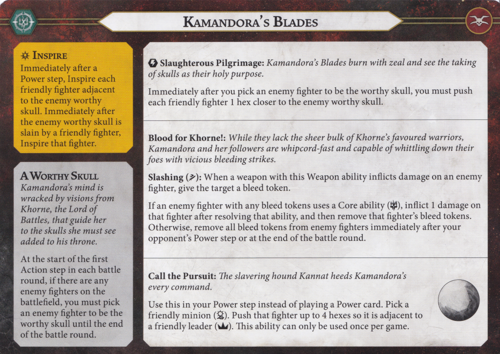Offensively, Kamandora has a pretty basic weapon profile that's a tweaked version of the "leader stick" profile. She sacrifices any reach to tack on the Slashing weapon runeword. As talked about above, this is a runemark with a lot of potential play and counterplay tied to it. You can't quite do the mental shorthand of looking at Kamandora's profile and assuming it's 3 damage but the potential is there, which makes this an interesting profile. 2 hammers, 3 damage is a profile restricted to the truly heavy hitters in the game like Kro-jax or Gorlok so having it even as a potential is pretty impressive. Once inspired, the only change Kamandora has is picking up an additional attack dice. While that's always welcome, it's not a stark change. I'm tempted to use Kamandora herself as a forward deployed dangle fighter to bait attacks since she has the best uninspired save profile in the warband. The only hesitation I'd have is that Call the Pursuit requires her to be alive and in position in order to get the big 4 hex push on Kannat – but maybe yanking the Khorne dog up to the front lines in the first power step isn't necessarily a bad idea.