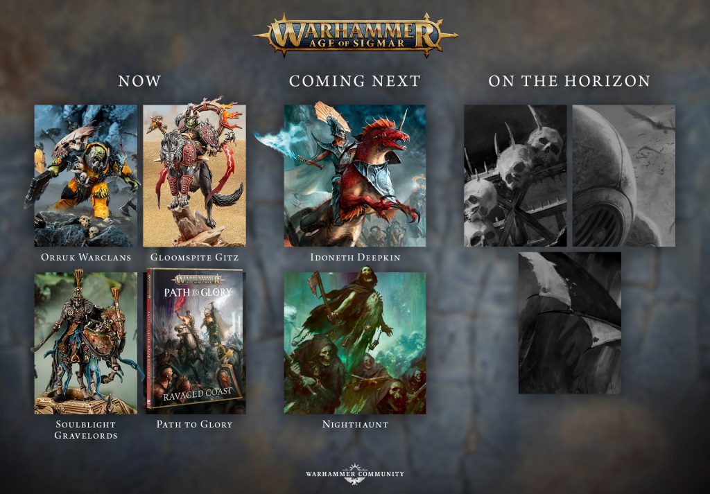 GW capped off the AOS reveals with a new roadmap, showing Soulblight Gravelords and a Path to Glory book releasing imminently, followed by Idoneth Deepkin and Nighthaunt “coming next”, and a trio of black and white releases to follow. Based on the images, we’re pretty sure that they’re Blades of Khorne, Kharadron Overlords, and Daughters of Khaine.