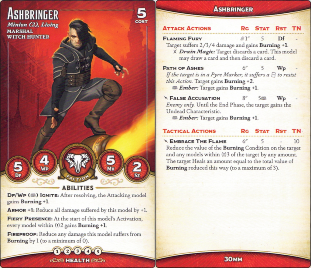 Their other attacks are just kind of so-so. False Accusation is a pretty situational bonus, although a built-in Ember trigger makes it sting less in Witch Hunter. And Flaming Fury is a reasonably strong attack for a cheap minion, especially with the excellent Drain Magic trigger, though Stat 5 is a bit of a bummer, and Ashbringers are really too fragile to want to be out there mixing it up.