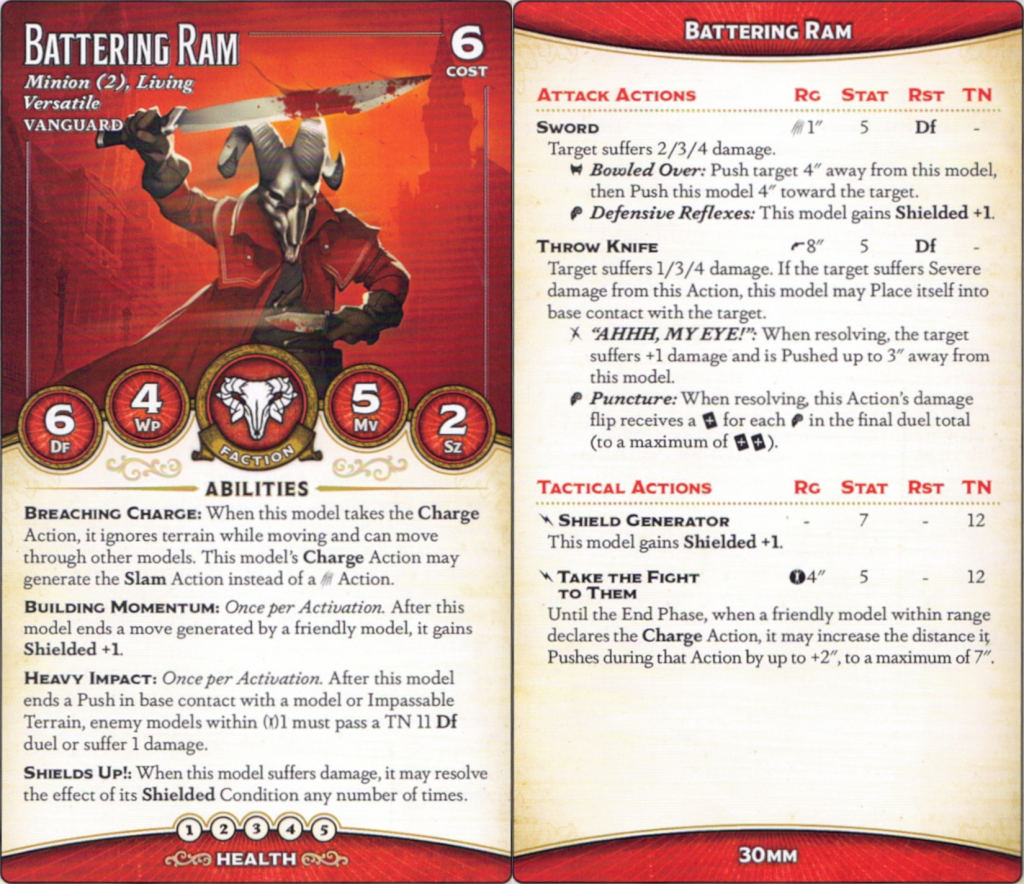 Breaching Charge and Heavy Impact are both cool and flavorful abilities, although I don't think you'll Charge-Slam very often, but the Rams' attacks are pretty anemic. Throw Knife is a neat attack that's very much let down by its Stat 5, and the Sword is very much replacement-level. Take the Fight to Them is pretty interesting, since AOE movement tricks are rare and special in Malifaux, though this one does have some limitations - as fun as a 9" charging Dashel2 would be, it just won't happen. And a 7 is a real card. So unless you're going for the full Vanguard package, or you have a specific trick you want to do that involves Lady Justice or a Peacekeeper charging a wee bit farther than normal, I think you can leave the Rams at home.