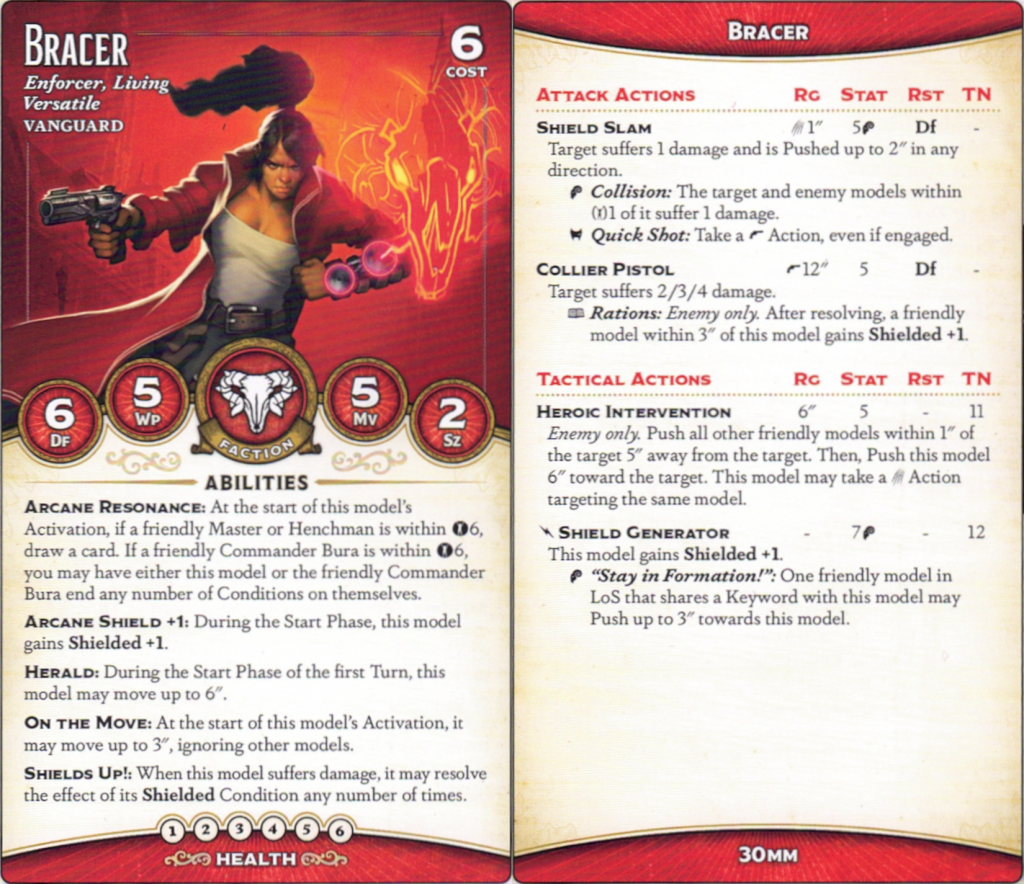 You may not want to dangle Bracer too far out there, though - Df 6 is nice, as is Arcane Shield, but her health pool is very small, and she's only got the one Shielded to start with. (She also wants to stay near Bura or at least your Master for Arcane Resonance, which limits how much you can afford to send her out). Shields Up! is obviously very strong, but you'll have to work a bit to put more on her. She gets one during her activation, obviously, and the built-in trigger to pull a friend up the board is quite strong, but that often won't be enough by itself.