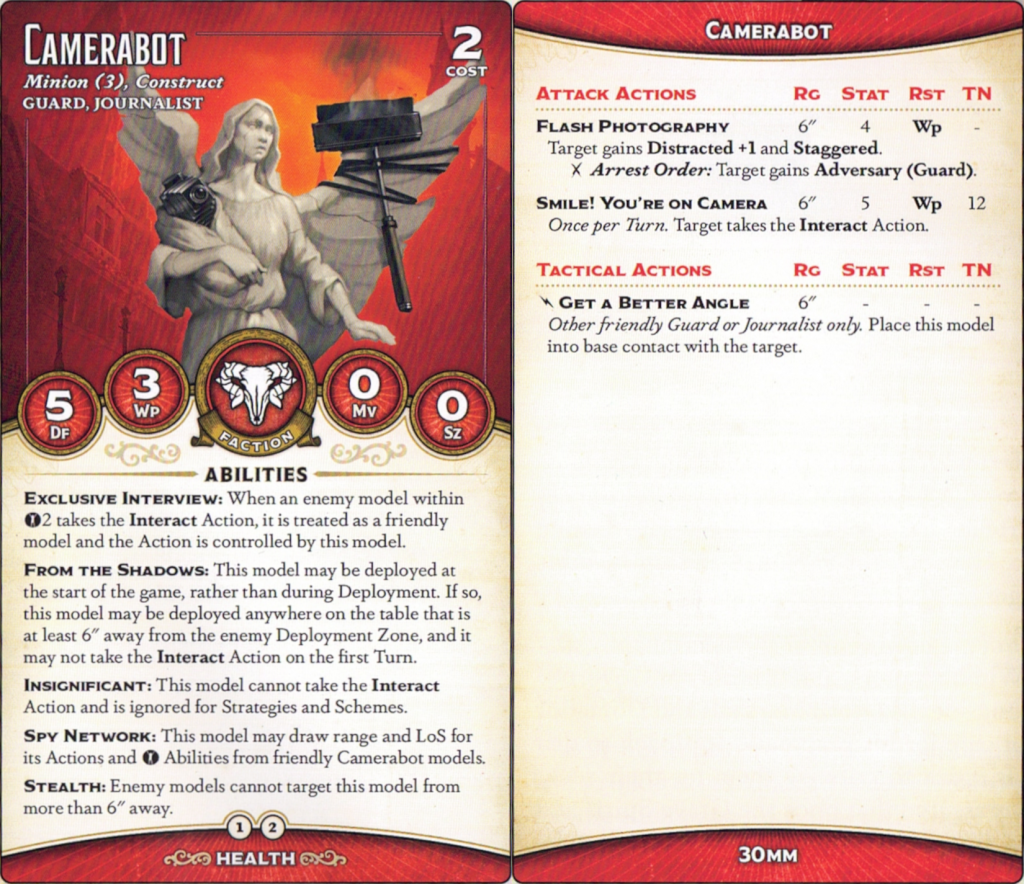 Walk the Line is another very strong ability, letting you reposition friendlies and even occasionally draw cards. Sometimes you'll be using it to pull people back to safety, sometimes nudging them into position. Sabotage Their Plans is very very useful when you need it, and you'll know when you need it, but I think more often you'll be summoning Camerabots. The fact that you target a piece of terrain makes this ability somewhat variant depending on the table: if you have lots of little rock formations or whatever, you are more limited in where you can put them, but if there are a couple of big houses, you have a lot more freedom. There's a built-in trigger to push any Camerabot 4" (not just the one you summoned) to get the perfect angle, and remember you can channel this action through a Camerabot and thus leapfrog them up the board.