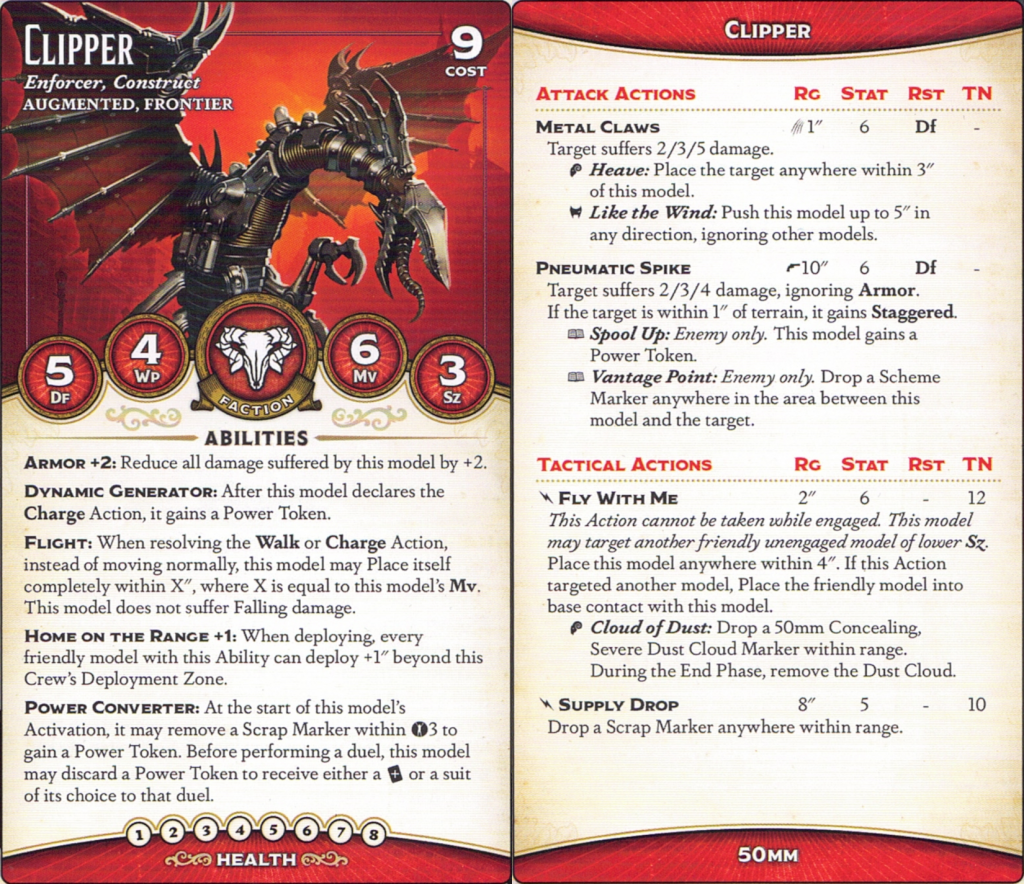Because Frontier doesn’t generate Scrap Markers (aside from Clipper himself), he has Dynamic Generator to gain Power Tokens from Charging, which means he can reliably give himself one almost every activation. Between Flight, Fly With Me and Mv 6, he’s extremely maneuverable, so it won’t be hard to get him where he needs to go. You’ll have to be at least moderately careful about positioning his big fat base – he can generate his own Concealing Terrain (in the form a dust cloud), but despite his armor his defenses are pretty low, so anyone with armor piercing attacks is going to kill him quick.