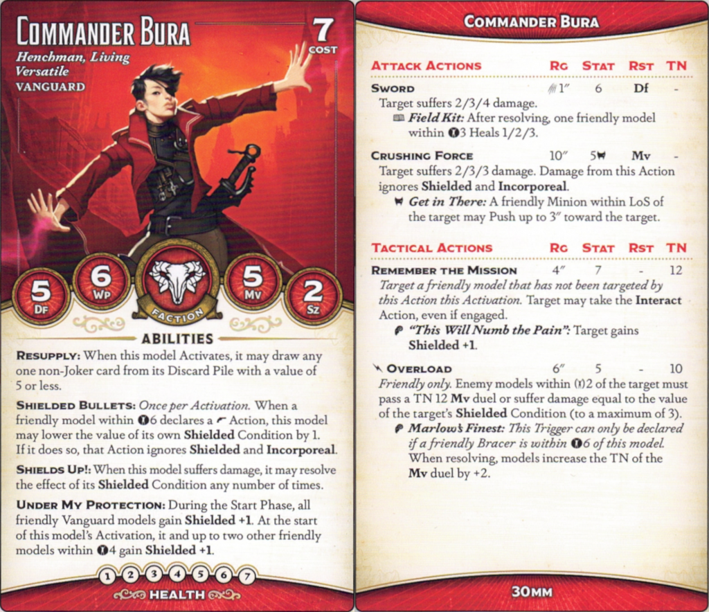 The Vanguard keyword is all about Shielded. Shields Up!, the “keyword ability” that they all share, is a real doozy. Being able to eat a big stack of Shielded to reduce incoming damage by a larger amount is huge, since Shielded is one of those conditions that it’s pretty easy to stack up in big numbers, and it is also one of the very few ways in the game to reduce damage to 0. What’s more, Bura’s player has the option to apply Shielded any number of times, so you can no-sell a huge attack or simply whittle it down low, knowing that you have some healing incoming on your next activation. This is a bit of a build-around but it’s a tremendous asset and one that makes Bura much tankier than her 5/6/7 defensive stats indicate.