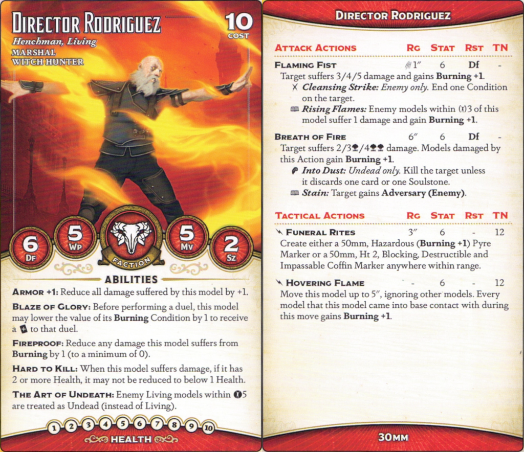 Breath of Fire is likewise a very nasty attack, especially with Execute (and it is Execute, because of The Art of Undeath), and Stain being close to a "delete this model" trigger as well. It's always been let down by its short range, but Rodriguez has that handled, too, with Hovering Flame. That's an absolutely bananas bonus action, a 5" move in any direction ignoring models, and it's doubly scary on a brick shithouse like Rodriguez.