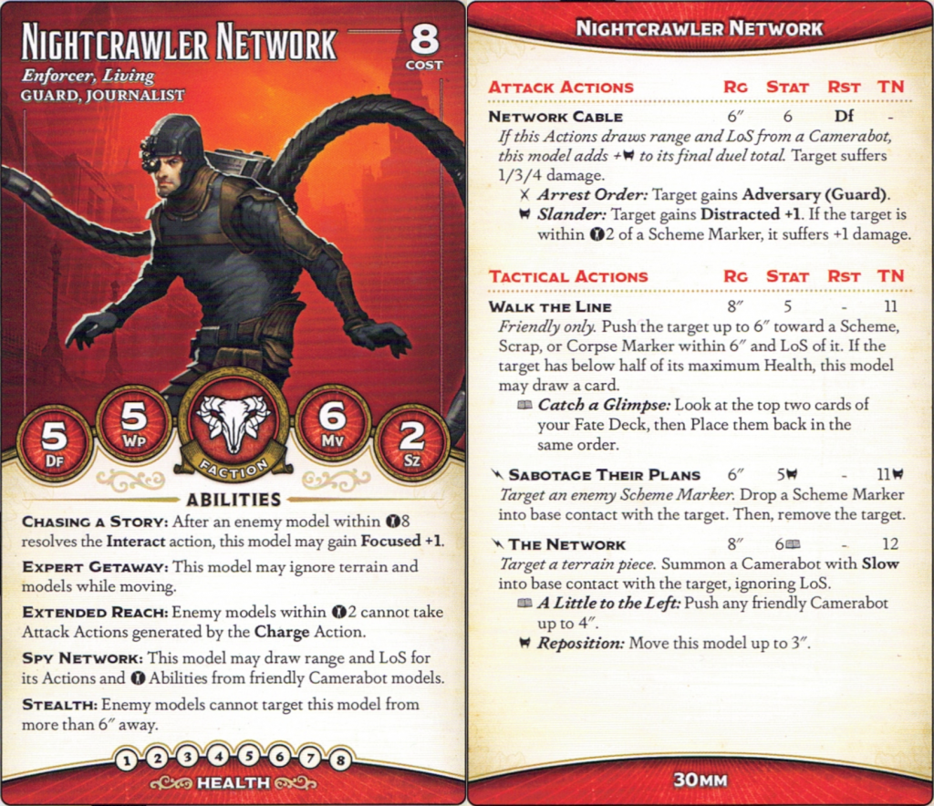 Spy Network is a frankly insane ability. It gives you incredible board coverage, making it super easy to attack wherever you need, and making stacking Focused with Chasing a Story very easy. His actual attack and tactical actions are pretty good, too: Network Cable is unimpressive unless Focused, but as mentioned, getting Focus here is pretty easy if the scheme pool requires Interacts; and the built-in Slander trigger makes it a lot more dangerous (mostly for the Distracted, though occasionally being a 2/4/5 is nice).