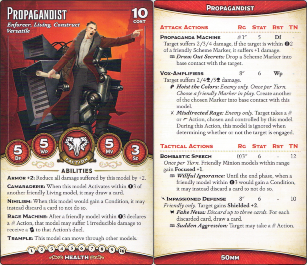 The Propagandist can put itself in danger if it wants to trigger Rage Machine, but in my experience playing Bayou with the Mechanized Porkchop, that rule is less good than it reads. It typically wants to be near your crew, drawing cards with Camaraderie and pulsing out Focused with Bombastic Speech. The latter deserves some mention - Focus pulses are very strong in Malifaux, though this one being Minion-limited does limit its usefulness a bit. Still, there are some Guild Minions that really benefit from Focused (Hex Bows, Executioners, Witchling Thralls), and Willful Ignorance is a super strong trigger. Remember, that part is not minion-only: sometimes you'll give a Bombastic Speech with no Minions to buff, purely for the trigger.