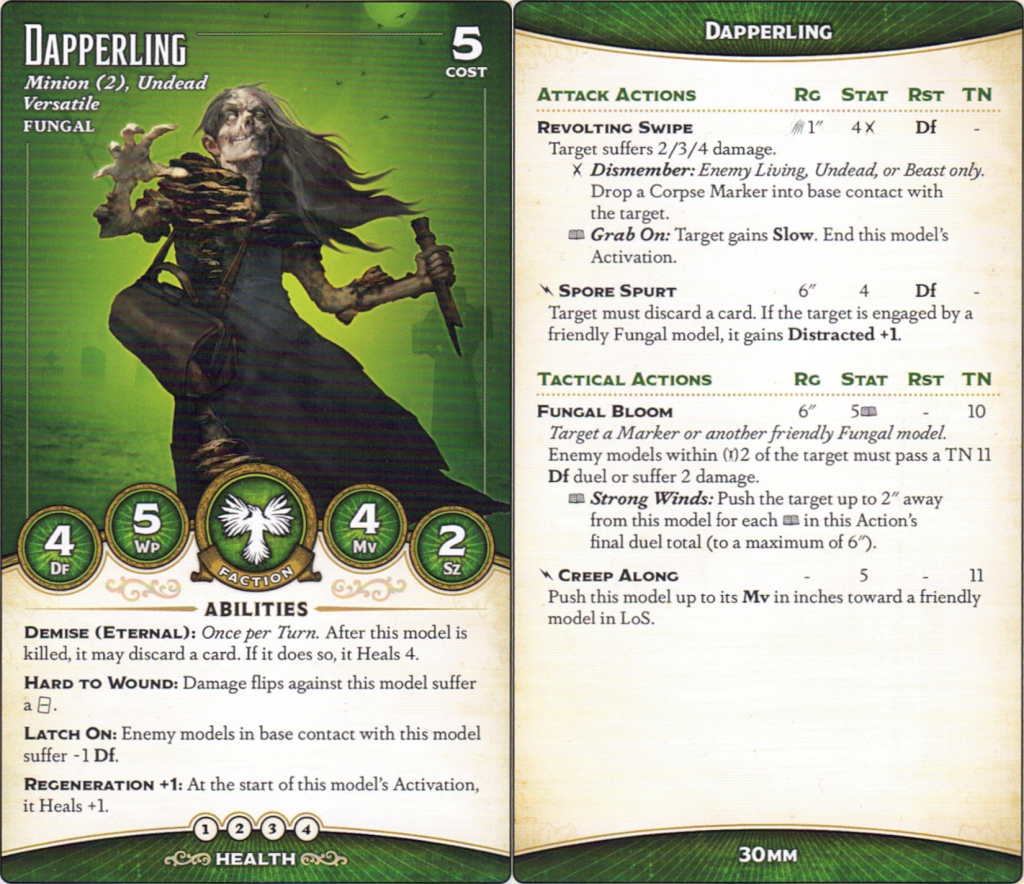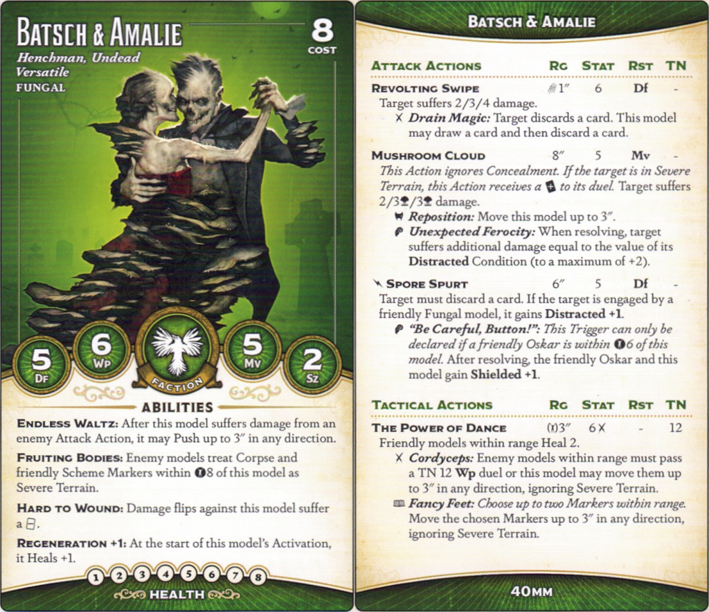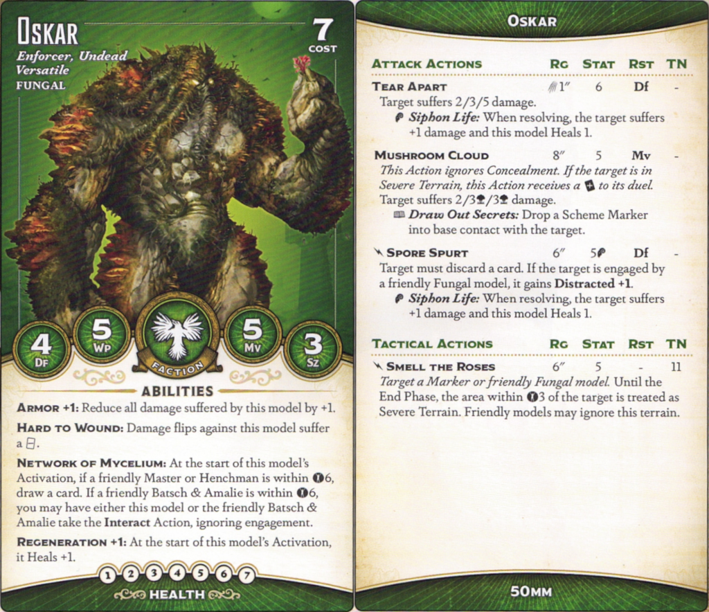 Ressers finally get their starter box, and it's mushroom-themed! Who woulda thought?Batsch has Hard to Wound and Regeneration, a solid suite of defensive abilities. Endless Waltz is mostly just a slightly weaker version of Butterfly Jump, in that you have to actually suffer damage and must Push instead of Move, but Butterfly Jump is really strong so there’s lots of room for an ability to be weaker than that and still be good. The really interesting front-of-card ability here is Fruiting Bodies. Some enemies will totally ignore it, and usually there aren’t that many random Corpse or friendly Scheme markers around (and the fact that they do have to be friendly is definitely a limitation), but if you can spread enough gore around, you can really make life difficult for your opponent. Individual patches of Severe Terrain are easy enough to avoid, but in multiples they can ruin charge math and make positioning a real headache.