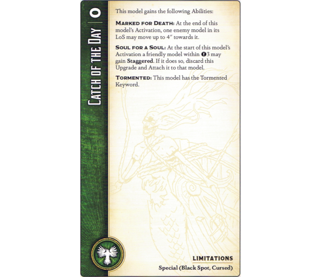 Her Stygian Hook is a bit odd. The damage track is nothing too special, but You're Coming With Me is a really strong trigger to build in. Obviously this triggers in the mirror match, but she really wants to be attacking enemy models that you've gotten a Tormented upgrade onto (or a friendly Guilty). Once the upgrade is in place, she can either yank them around the board or get some extra damage, either of which is nice.