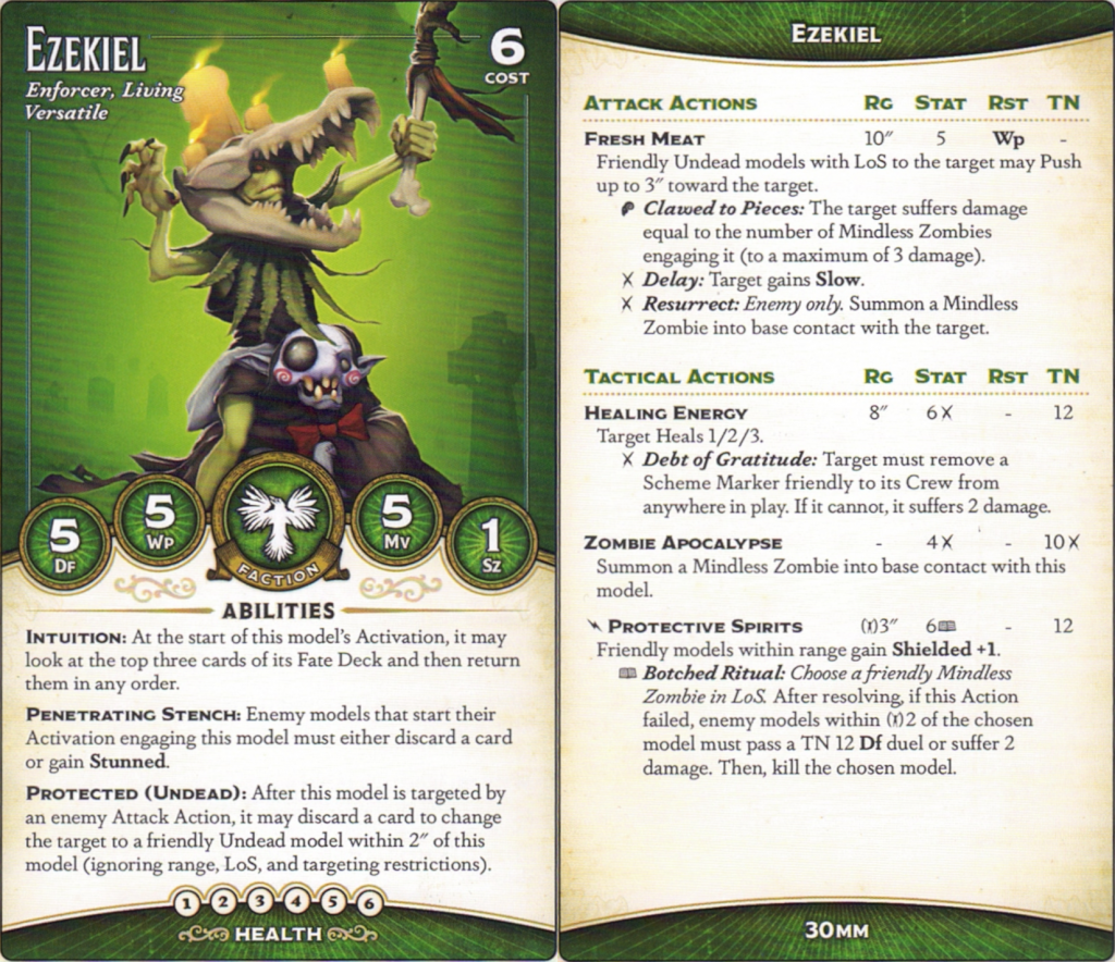 Ezekiel’s cheap for an Enforcer, but brings some interesting tricks to the table. He seems a bit like a bargain Asura Roten – he’s more fragile (though Protected helps a LOT) and his summons are still Insignificant, but Intuition is a big deal for a model like this: you don’t have to waste cards on him since you can just stack for your TNs. Protective Spirits is a pretty strong action if you can set it up right, although there’s an interesting tension here because you need it to fail in order to blow up one of your zombos. Similarly, there’s some lenticular design with his Healing Energy, since he can either heal an ally or force an enemy to eat a scheme marker (or force an ally to eat a friendly scheme marker, a bit cornercase but occasionally useful).