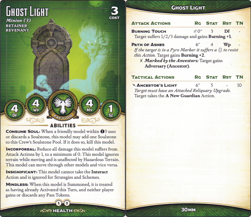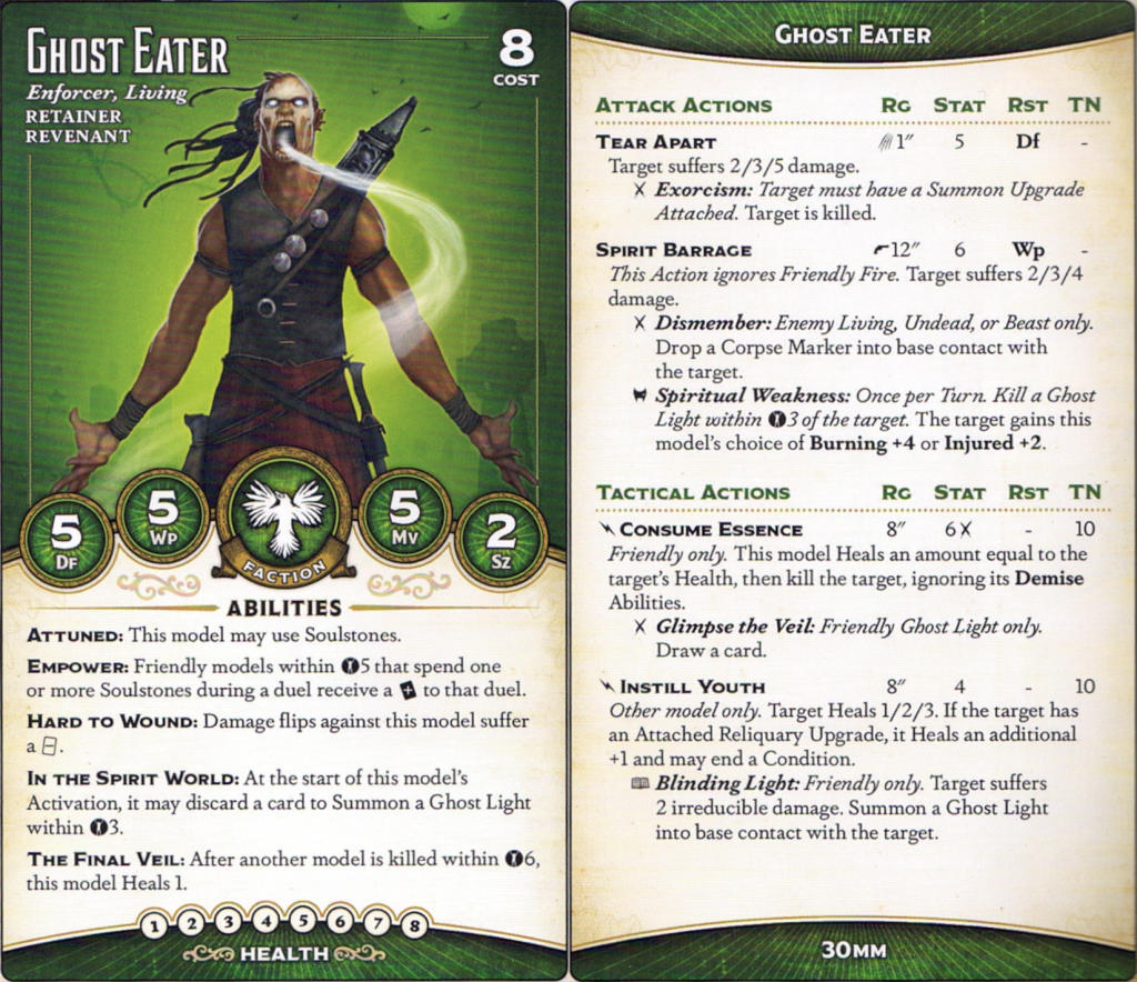 Tear Apart is sort of a replacement-level attack, though Exorcism is a very strong trigger. Remember, you can stone semi-freely for triggers with this guy because of Ghost Lights. Spirit Barrage is a solid ranged attack, and Spiritual Weakness is a devastatingly strong trigger: Injured +2 is often a death sentence on a target.