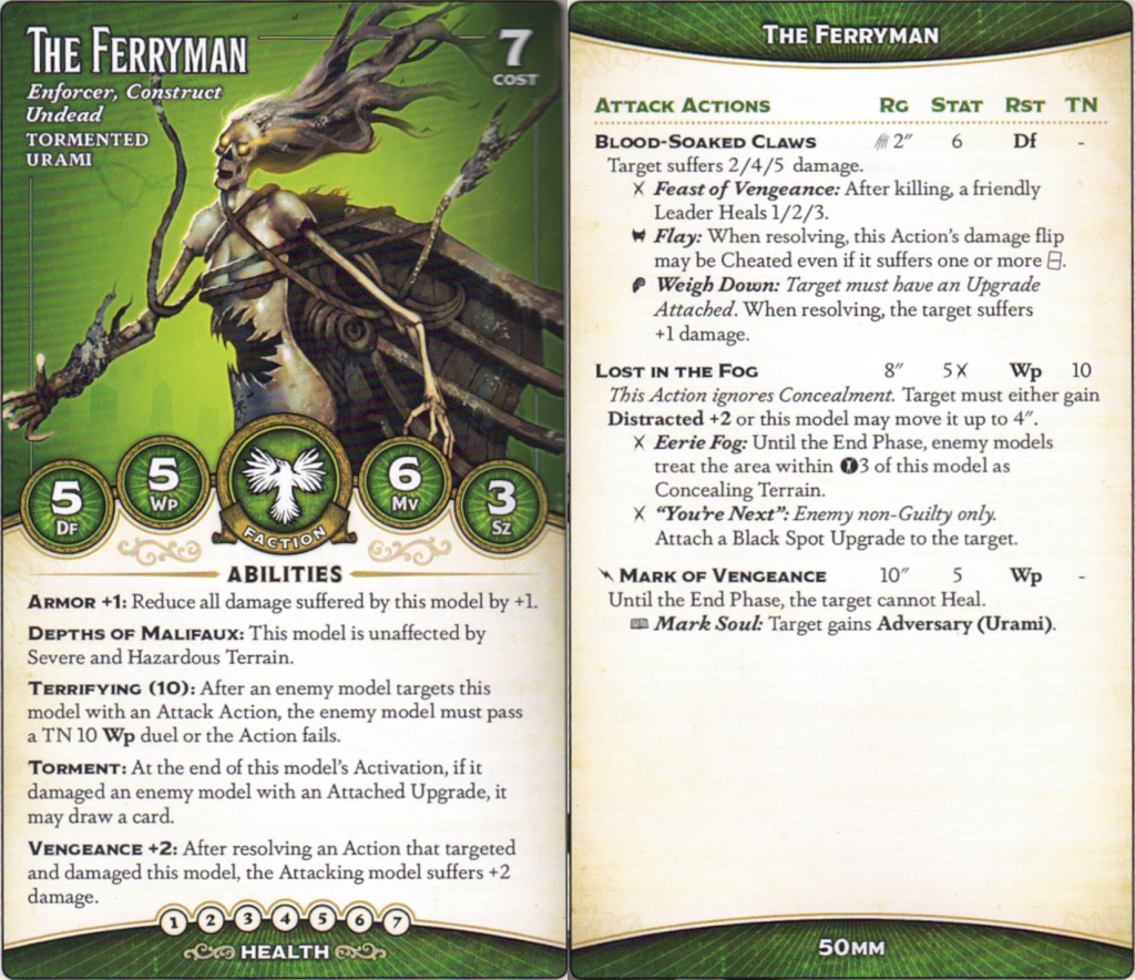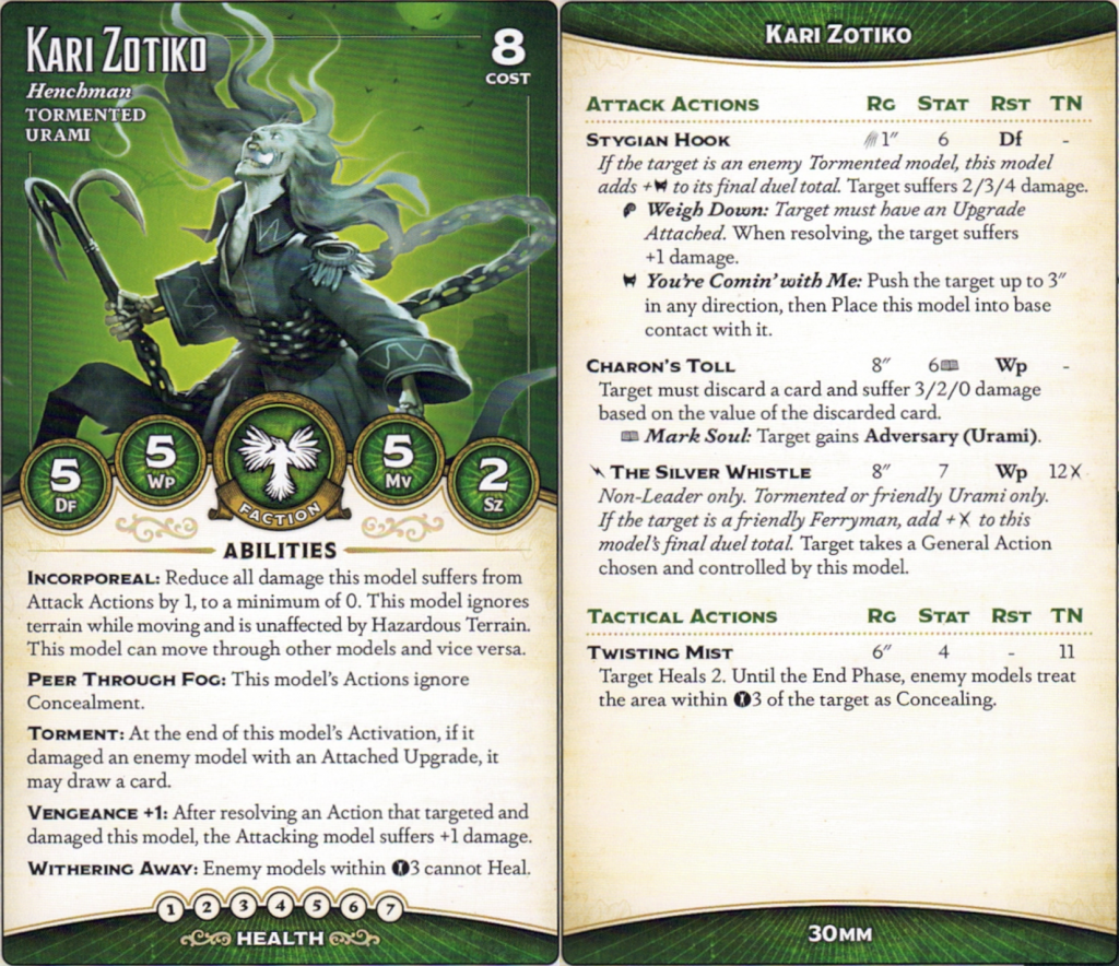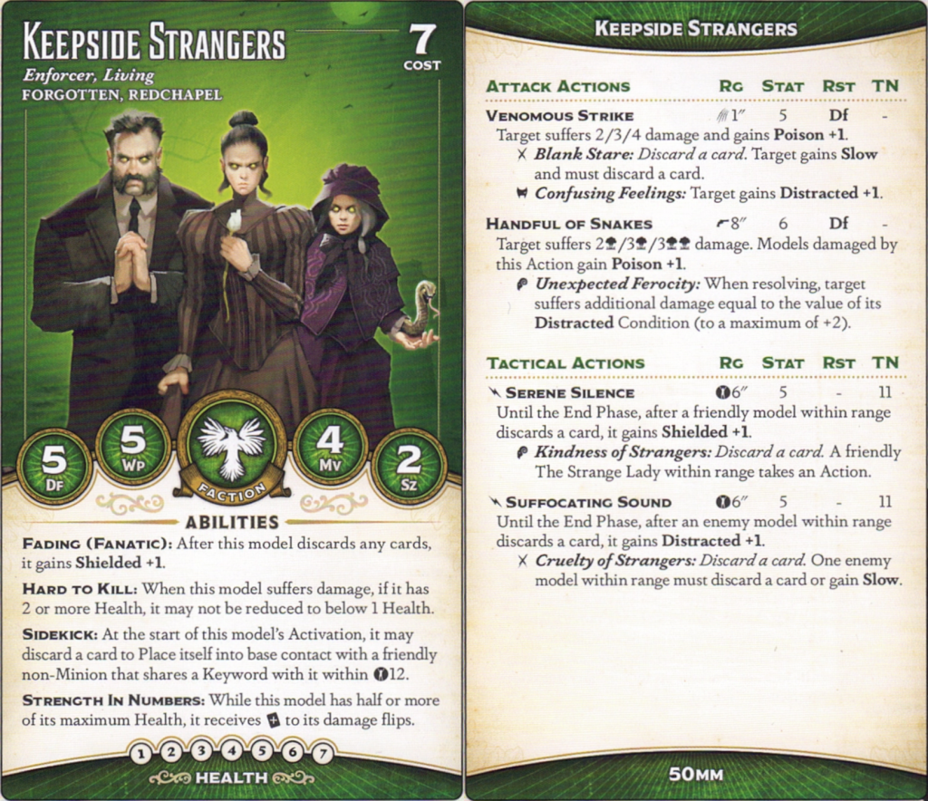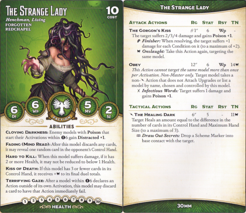 I don’t think I’d want to Venomous Strike very often, but I guess it’s there. Mostly, I think you’re taking these guys for their Tactical Actions. Serene Silence is a bit of survivability for a Forgotten crew that also serves to give the Strange Lady another action (and I think I would try very hard to always have that 6+ of rams to hit that trigger), while Suffocating Sound is more offensive: you can basically force an enemy to choose between Slow and Distracted (plus losing a card). Not a fun choice, especially if you’re staring down the barrel of the Strange Lady’s Finisher.