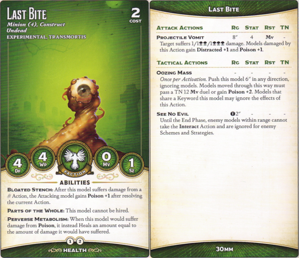 Last Bites are odd. They can’t move at all outside of Oozing Mass (although they should ideally be in position to score by the time they show up, and I guess other models in your crew can push them around). They’re still Significant, and while they die to a stiff breeze, you do get four of them for free. And while Projectile Vomit at stat 4 isn’t lighting the world on fire, it is very annoying when it hits, and See No Evil is great. Your opponent doesn’t want to spend four AP killing models that they’ve already killed three times, but they may have to, because a Last Bite camping a Strategy Marker shuts off scoring until dealt with.
