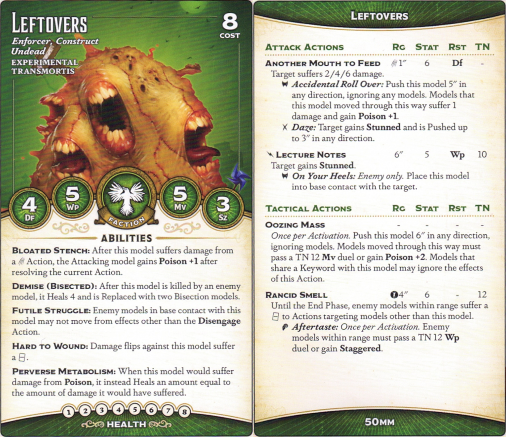 The Leftovers isn’t embarrassing for 8ss, at least. Df 4 isn’t great, but it’s typical for Ressers, and the requisite Hard to Wound means Min 2 attacks will take a while to chew through this thing. Bloated Stench also lightly punishes opponents who try to take this thing out in melee. Actually, melee is where enemies really don’t want to be – Futile Struggle does a good impression of applying Staggered (though remember that it requires base to base contact, while the Leftovers technically has a 1” engage.