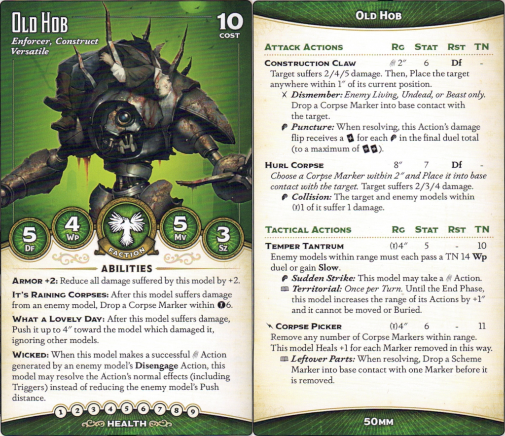 That said, a 2/4/5 damage track isn't that inspiring for a ten-stone beater, and the triggers here are just so/so (although Dismember is better on Hob than on many other models who have it). Hurl Corpse is pretty appealing, especially at Stat 7 - sure, the damage isn't great, but Collision is a nice trigger, and there are upsides to bonking a Corpse into an enemy (such as setting up a summon in their face).
