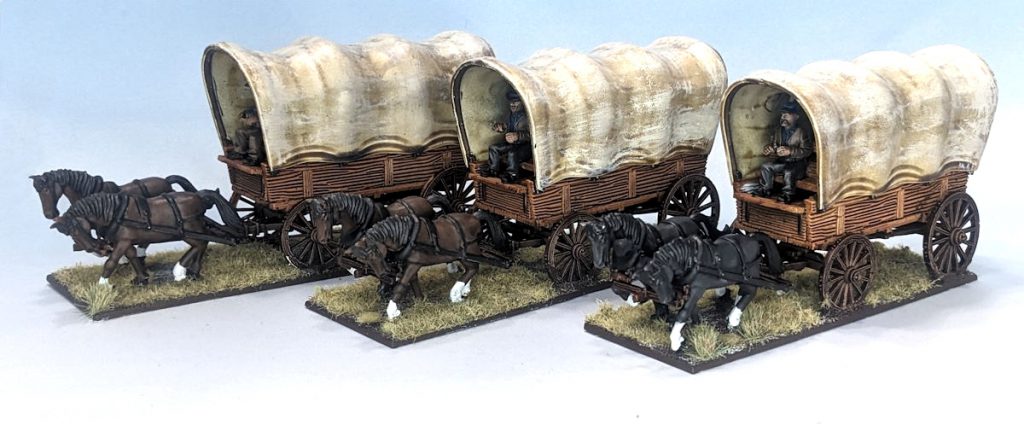 A side-on view of the three wagons. I like the effect the contrast + drybrushing has. Credit: Michael O "Mugginns"I liked this kit enough (check out the review here) that I had to grab three and I might get some more at some point. Having a big ole' wagon train to defend would be super super cool. The kit is well-priced, goes together easily, and paints well. Grab this kit for your black powder era fights and go west, young goon.