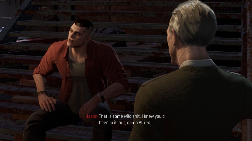 This is a good look for Jason. Sadly the Red Hood in costume looks mostly like linebacker Deadpool in this game.It turns out he’s the star of this show. Dick, Babs, and Tim are all well-written, but they’re very rote. That’s kind of understandable; Dick and Babs have been the same characters for almost half a century now, and the biggest change in Tim’s status quo since his introduction 30 years ago -- his coming out as bisexual in the comics last year -- has basically no relevance to what’s going on in this game. Jason, the second Robin in the comics killed off in a 1988 comic plot and returned exceptionally clumsily in 2005, has been sort of drifting since his reintroduction; no one has really been sure what to do with him, given how clownishly his return was handled, and the decision to give him non-lethal guns as his main weapons hasn’t really allowed anyone to endear him to being taken seriously. A lot of stuff involving him is just stupid.