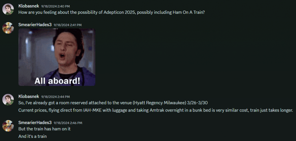 Rob: This reply here is a clear indicator of why Andrew quickly became one of my favorite people.Andrew “Hero of Team Imperium” Corban: Adepticon was an event that had been on my To-Do list for a long time, so when Greg suggested a trip AND a train ride I was sold immediately. Like many nerds I was raised as a Train Guy by my father, and his father before him, but have never taken a train trip more than an hour or two before so I was pumped to give an overnight trip a try. Then he told me about the possibility of Ham Train on top of that and I was Doug Doublesold.
