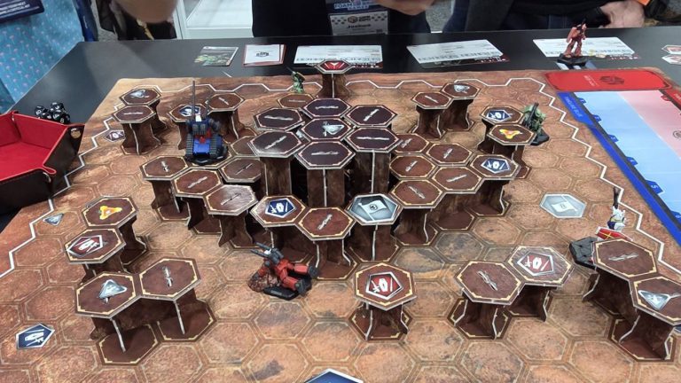 Char put the Guncannon directly into the dumpster. Credit: FowlerJake "Starting Hex" Bennington: There appear to be a ton of different tokens in the game. Multiple denominations of damage and victory points, timeline tokens, objective tokens, garrison tokens, upgrade tokens, energy tokens… It's a lot to fiddle with, but it seems like any of the unit relevant ones sit on your unit cards while the ones on the board are there to mark special hexes on the board so there aren't any "floating" tokens that have to follow your models around. That's nice from a clutter standpoint, but I worry about how devastating it'll be if someone bumps one of these tables.