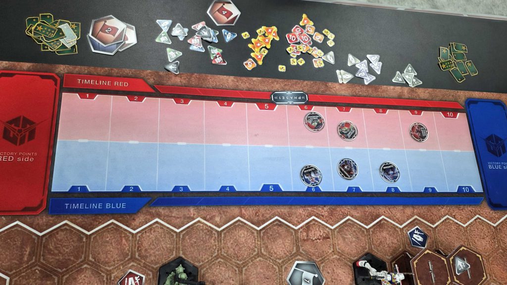 The timeline, from the GAMA demo. Credit: FowlerActivation order is handled with a large tracker off to the side of the board called the Timeline. It's... a timeline. It starts at 1 and goes up to 10, with each number having a box near it so the players can put their unit tokens there. Each of the primary actions costs time to use, which will bump the unit's token up further along the timeline. Units also have different starting points on the timeline. More powerful units might have a higher starting value, so they won't get to act until multiple other units have gone. Play starts at the 1 spot on the timeline, and any units there are able to activate. Once a number on the timeline has been emptied of units, it progresses up to the next number and so on until the end of the phase is reached. That's when scoring for objectives comes into play and (if applicable) the next phase kicks off.