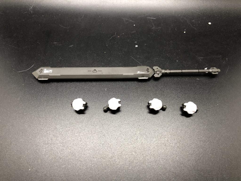 That's it! That's all the accessories you get.If you want the other stuff, you’re buying another box. I don’t love this, but the hands are fairly standard HG fare, so you can jam whatever else you want in there, if you don’t mind breaking canon. Of further annoyance, the hands like to fall apart from the weight of the huge sword - the back and the fingers, the only two parts, aren’t joined together very strongly, and you can’t even glue them, because the pommel doesn’t come off the sword. If you want to be able to remove it, you have to disassemble the hands, but they also like to spontaneously disassemble themselves.