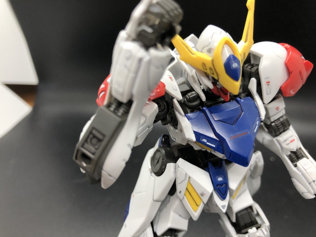 The other problems are more intrinsic to the IBO HG line. These kits don’t tend to come with a lot of accessories, because they sell the wider array of weaponry and upgrades in separate packs. Barbatos Lupus here has slots in the forearms for mounting a couple of big honking cannons, but the guns aren’t in the box, they’re in an options set. By default it just comes equipped with the big blunt “sword” and an extra pair of hands, and that’s it.