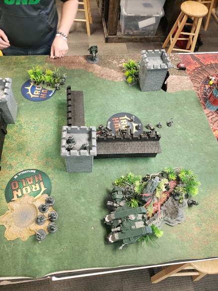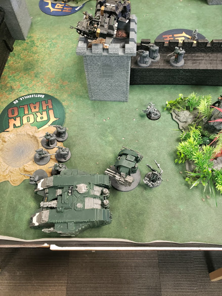 Move up the Table - Featuring Speeders in Towers!So then it was Cyle's turn and well... I must say I learned a lot about what you can do with the Raven Guard book. First off, did you all know there was a Warlord trait that provides the ability to charge after advancing and the Hungry for Battle trait is +1 Charge AND Advance?! Cyle ran his deployed aggressor unit through the wall, then opened up with some cheeky shooting, using his thunder fires to kill two units of scouts. He left one alive on the north objective which at the time I couldn't figure out why right away then I saw it... I also saw he had run some scouts up as well...