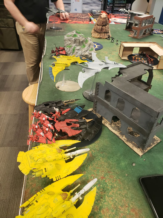 He deployed everything he had in his top NW corner, just his planes visible to my Speeders, as planned. He started his Shining Spears and Autarch off the table and rolled to seize. He didn't. The first turn and victory were sure to be mine.