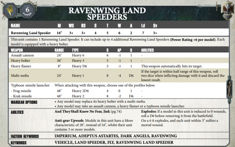 ++++++Land Speeders. It isn’t 5th edition anymore Chase and you aren’t playing Space Wolves. 490 points for 30 wounds with 10 krak missiles isn’t terrible. However they don’t get to ignore heavy modifiers, and do not have a real Chapter Master to get over the negative modifiers because you are still in Dark Angels. You are also spending a pile of points on a great model in the Talonmaster, but are using it to babysit backline units where his real strengths of having 18 shots and a power sword on a character platform aren’t being used.++++++
