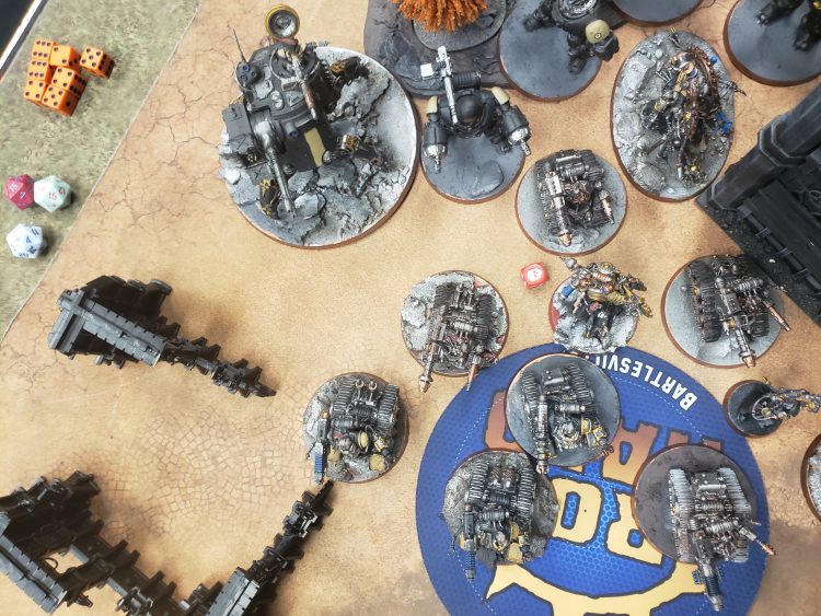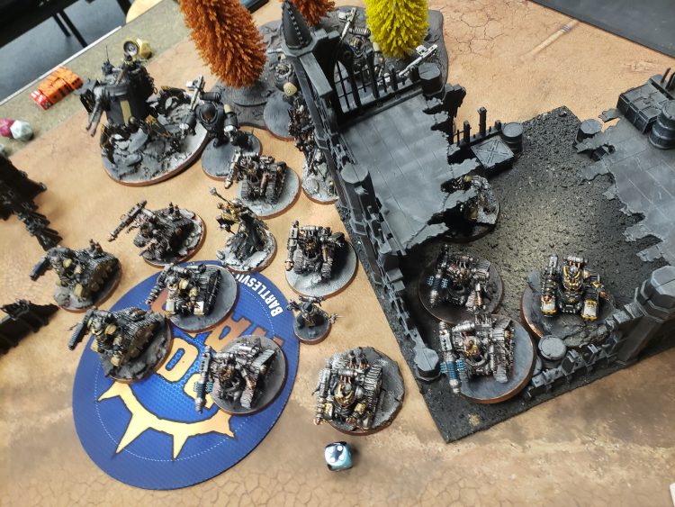 My opponent has a straightforward deployment. Get his guys in Cawl's aura, line up the shots and make sure I lose as many models as possible. Robots were in the middle, and the Kataphron Breachers filled the center and a ruin.