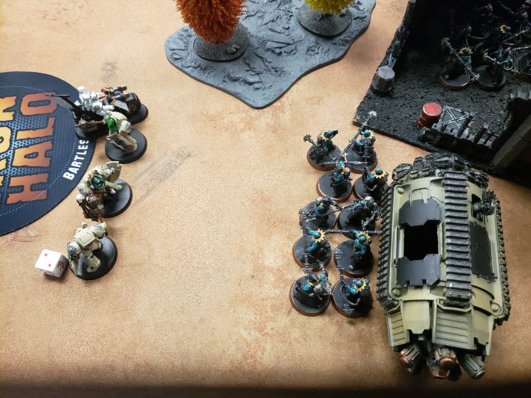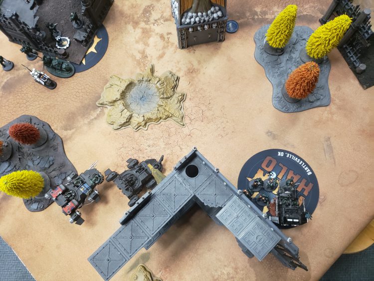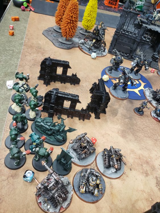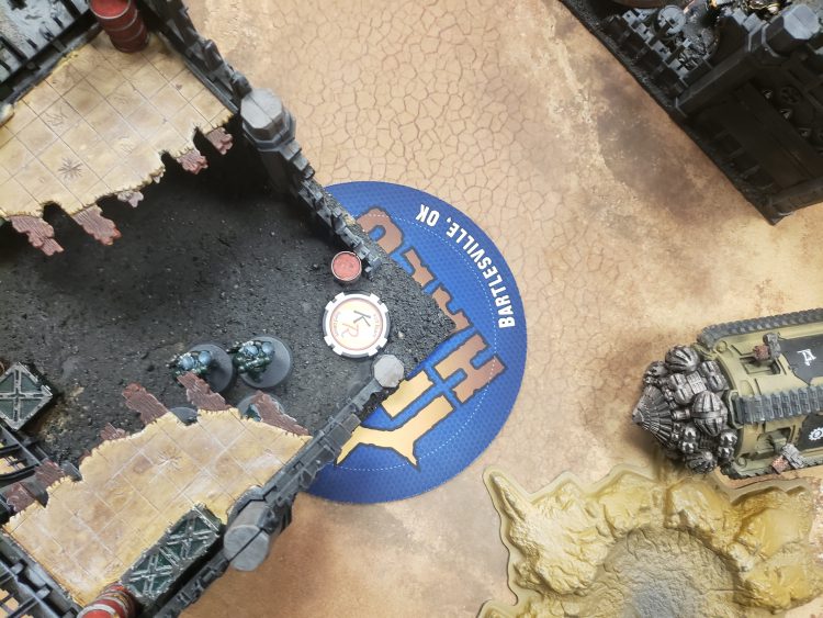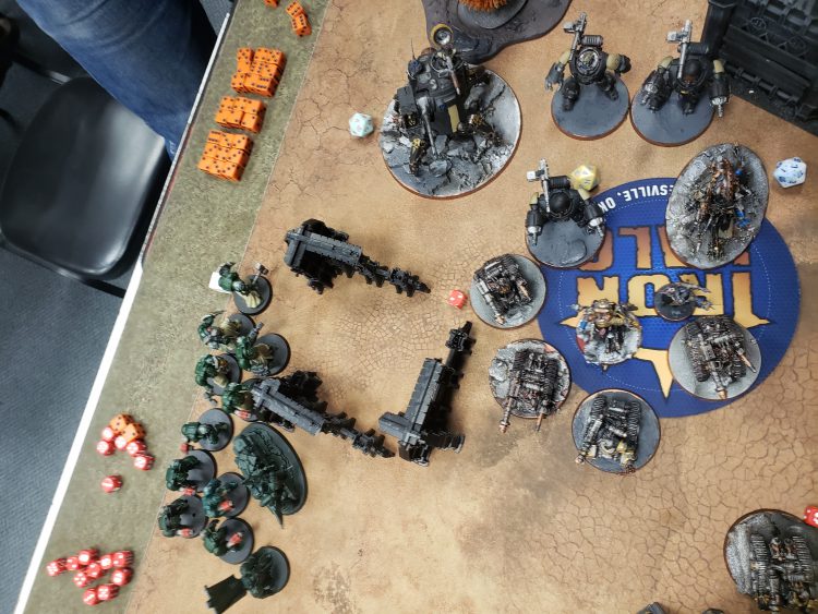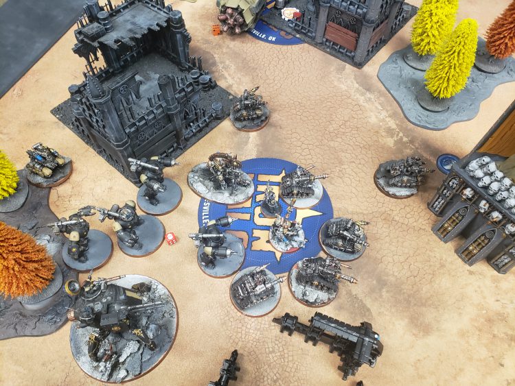 When a clear sightline is all you needThe end of my shooting phase was pretty straightforward. I didn't kill any whole unit, but I felt like I had done some extreme damage, knocking down a robot as well as some Breachers. Due to some bad rolls, I only got six damage onto the drill, but I was sitting on 3 objectives, and I was in a great position for the next turn. The only guys I was apprehensive about were the poor Infiltrators who were holding the line versus the drill.
