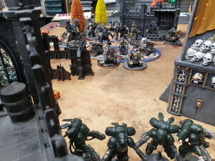 Brave Not Dark Angel deployment.Using the L blocker was a clear choice, as my units already have enough movement to jump over the L without any issues. I felt really good at going first or second by the time we were all done deploying. Not only that, but by using the Outrider warlord trait, I did get my free 12" move to react to anything crazy.