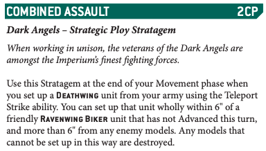 Cyle: +++Ok, he has gone off to find some models off the office shelf, muttering about paint requirements. This is what I was going to get at; Combined Assault is the best part of the DA book, and building around it is the reason to wear this flavor of green. However, the requirements are a Deathwing unit coming down next to a Ravenwing Biker and not just any Ravenwing unit. I had some moments in the List Building Broom Closet where speeders were a bigger part of my idea of how this list should work until I was told that was "Mega Cheating" and "Cheating is in fact not winning" Because of that, I think the successor thing is a mistake. Jink is what makes RW playable, and therefore making Combined Assault playable. This Inner Circle stuff is almost a sideshow. ++