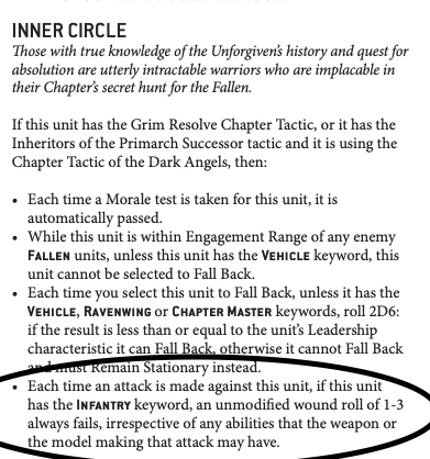 Okay. So, understandably this special rule is a huge thing to give up. Having the ability for some of the most durable units of the game to only be wounded on a roll of a 4+ is nearly game-breaking. Luckily for the community, this is mostly restricted to slow-ish Terminators and to some infantry characters who really would like to avoid close combat where possible. Now, I was just as impressed by this addition to my favorite green marines as anyone; Dark Angels finally getting something good? Maybe even making them actually competitive? Heck, even having it benefit the faction as a mono-build buff to avoid abuse in Imperium lists? What's not to love here? GW finally knocking a rule out of the park that is fluffy and good.