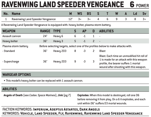 THAT'S RIGHT! The Land Speeder Vengeance. I think this unit is under costed by around 20 points, as its damage output has increased significantly, as well as its survivability. The changes to how vehicles and heavy weapons work? Priceless for them. Not to mention the change to their Supercharged plasma storm battery. Before, being it was only d6 shots, rolling low for its shots was a real feel bad moment. Who wants to blast somebody at S9 only one time? With the shooting profile changing to 2d3, we always have a minimum of 2 shots, and I've found so much utility with these guys. Also, as a successor chapter, I lose the special rule Jink, which would normally give these a 5++ invulnerable save when they move. Thankfully, since they still retain the Ravenwing keyword, I can use the stratagem High-Speed Focus to give one a 4++ invulnerable save if things start to look bad. At 120 points, these are a steal, and if you're playing Dark Angels, I highly recommend taking these mobile gun platforms if you haven't given them a second look already.
