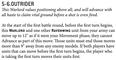 This warlord trait is currently where it is at for me. There is a Phobos warlord trait called Master of Deceit that used to do something along these lines, but it has been nerfed a bit as you have to redeploy before you know who is going first. Not with this trait! What I have been finding some great use with is taking my Ravenwing Chaplain and slingshotting him up the table to get much better positioning for my turn 2 drops with Combined Assault. Movement is King in this game right now, and having a reactionary ability to who goes first could even save a misplaced Land Speeder Vengeance or get a better sightline for our own first turn!