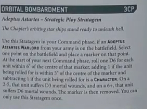 So I knew that this was going to be a shooting match from the get-go. Admech is always tricky since it gets that Shroudpsalm right away, providing it with that crazy cover save. So as the game began, I started it off with the most exciting thing ever when facing a shooting castle like this, the new and improved* Orbital Bombardment. Get on the hype train. Those of you who don't know how the new Bombardment works, let me quickly break it down for you.