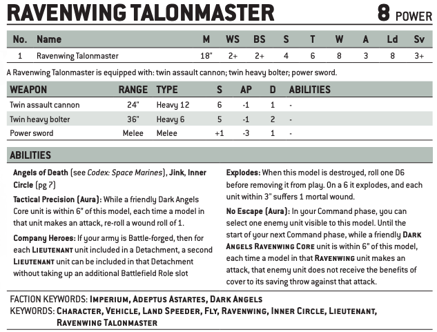This guy got some brand new tricks to go along with the brand new index. The two biggest changes right away are the new Big Guns Never Tire Rule that causes his heavy weapons to no longer be -1 to hit from his movement. Next, his movement gained 2" more inches making him a truly speedy boy. On top of gaining 2 wounds to put him to a respectable 8, the man is everything the Talonmaster of the last edition wished he could be. He now has the new and improved Heavy Bolter with its respectable 2D. Things aren't all sunshine and ravens in Talonmaster land, though. One of the reasons people take these guys is their amazing ignore the cover rule that used to apply to all Ravenwing. Now? He works as a bit of a support unit for core units, giving things like Ravenwing Bikers ignore cover for their mass boltguns or even multi-meltas off attack bikes. Not as cool as it no longer applies to characters, but it is relatively unchanged.