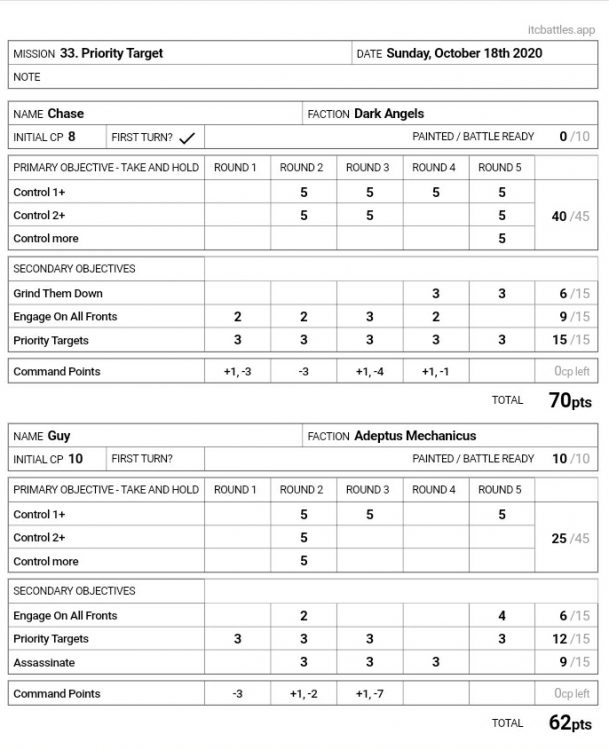 When I was thinking about what objectives would do the best for my list, I figured the best steps were to focus on what really stood out the most. First off, I had a pretty small yet hard-hitting unit count. With that in mind, Grind Them Down is an elementary go-to secondary for me. The Dark Angels of today and the future may be a meager model count army that is killing more than it is losing every turn. Next, board control is incredibly important. Using the Terminators mixed with the support of the Land Speeders to cover as much ground as possible, Engage on All Fronts felt like an easy placement. For most game types, I don't see these two choices being any different, almost regardless of matchup. Finally, and as a good lead-in on the game itself, I took Priority Targets as my final objective. As a general rule for all game types, always keep an eye out for the mission unique secondary. Some are terrible, some are great, but they are always an interesting option if you feel like you don't have any other options to take (Corrode: if you've read our meta articles, you'll note that Priority Targets was the single highest-scoring secondary in the game).When you see my opponent's list for this Hear Me Out next, you'll wonder why I didn't take something more....vehicle focused.